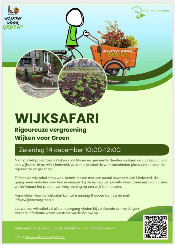 Op deze zaterdag konden bewoners van het Eikenderveld een kijkje nemen in Lindeveld, waar de rigoureuze vergroening in volle gang is. Youri Gijsen van de Gemeente Heerlen, Lars Vincken van BMM Groen en betrokken bewoners van Lindeveld gaven tekst en uitleg. De werkzaamheden zijn in volle gang en in januari wordt gestart in het Eikenderveld. Let ook op de mooie geveltuintjes met borderranden van cortenstaal, die we ook heel graag in het Eikenderveld willen introduceren. Informatie daarover volgt… Voor de safari was helaas niet veel belangstelling vanuit onze wijk, maar we hebben wel een goede indruk gekregen over wat we komend jaar kunnen verwachten. Fraai!