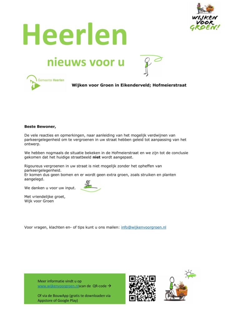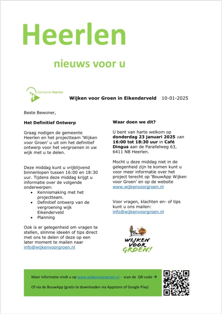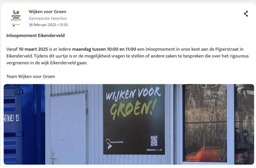 Wijken voor Groen organiseerde de eerste inloop voor wijkbewoners in het Markieshuis: Men kon kennismaken met Projectleider Youri (Gemeente Heerlen), de Tuin- en Landschapsarchitect (uitvoerende partij) én de plannen voor vergroening van Eikenderveld voor het eerst bekijken.